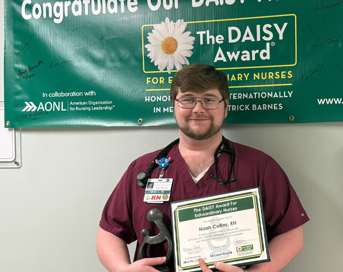 Noah Collins, a Registered Nurse with the McLeod Health Loris Medical Surgical Unit, was recently presented a DAISY Award for outstanding service and care. He was nominated for his professionalism and caring heart.