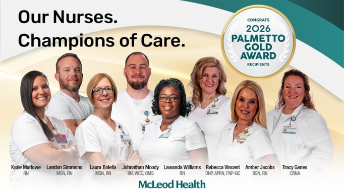 Nurses play a vital role in the overall hospital experience for patients and their families. For exhibiting outstanding excellence in their profession, 8 McLeod Health nurses have received the prestigious Palmetto Gold Award. These nurses represent McLeod Regional Medical Center, McLeod Health Clarendon, McLeod Health Dillon and McLeod Health Seacoast. They join the ranks of the 250 previous McLeod Nurses who have received this outstanding award.