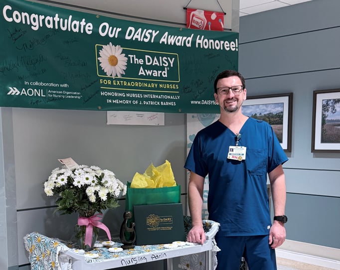 Jonathon Shannon, a registered nurse on the Medical and Cardiac Floor of McLeod Health Seacoast, was recently presented a DAISY Award for outstanding service and care. He received four different nominations for his professionalism and caring heart.