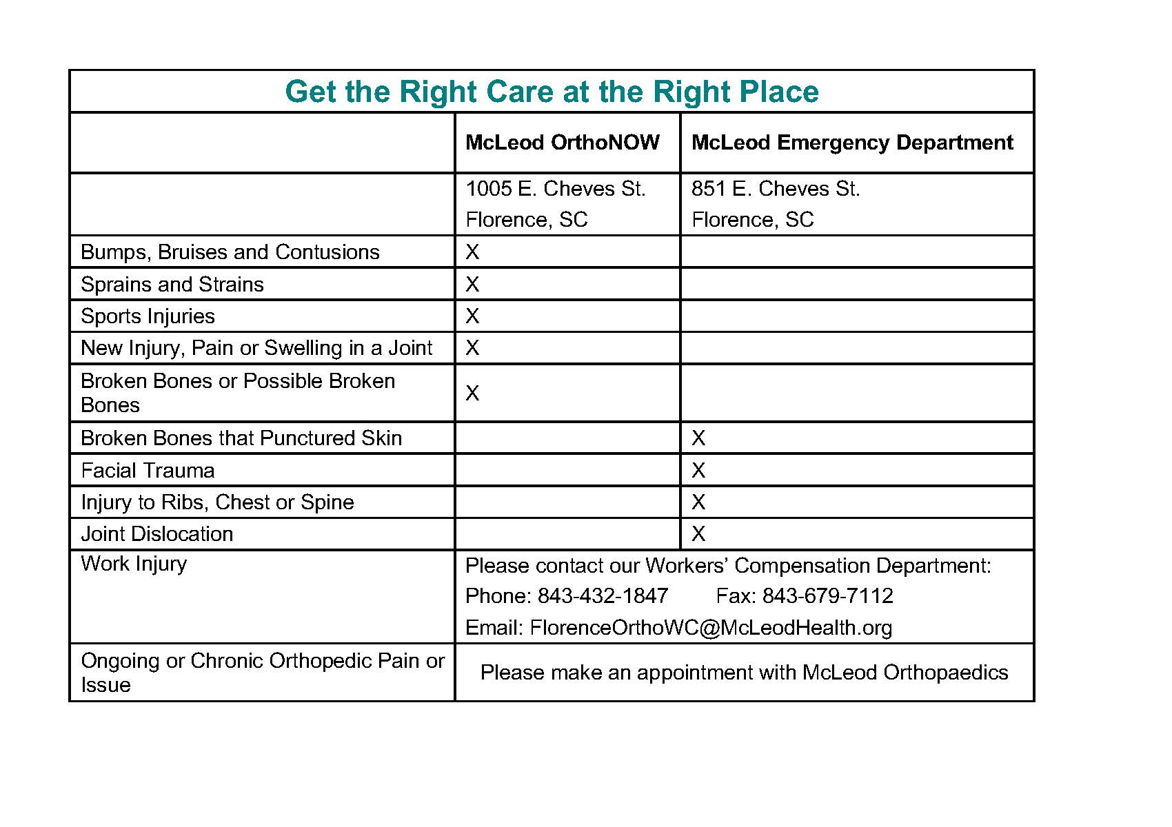 If you experienced a work-related injury, please call to schedule an appointment through our Workers’ Compensation Department at 843-432-1847 or email: FlorenceOrthoWC@McLeodHealth.org. Our fax number is 843-679-7112.